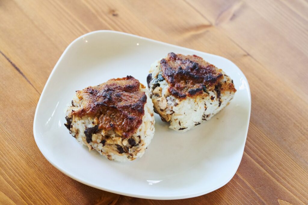 焼いてほぐしたぶりを混ぜ込んだごはんに、すりごまたっぷりの味噌だれを塗って焼き上げる、香ばしさが魅力のおにぎり。トースターで焼くことで味噌のコクと甘みが引き立ち、表面はこんがり、中はふんわりとした食感に仕上がります。ぶりの旨みとごま味噌の風味が重なり、どこか懐かしくほっとする味わいです。