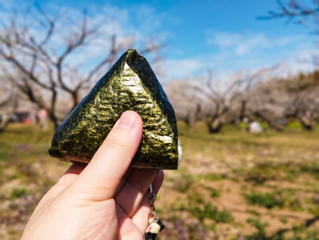 公園や広場のベンチで食べるおにぎり。
